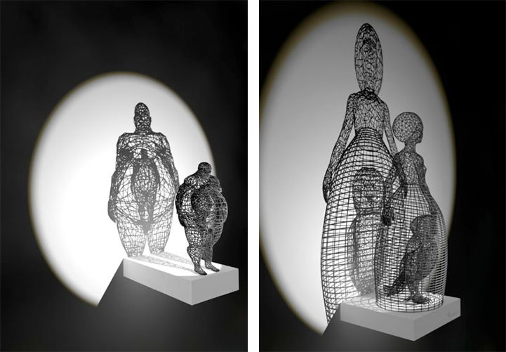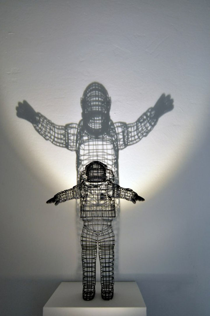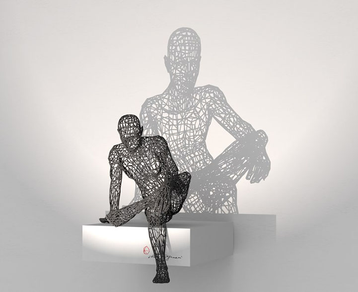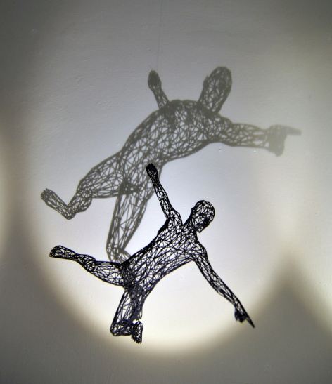 Some fragmented, some complete, some acrobatically frozen in time, and others delicately posed in seated or standing positions, all of the sculptures are brightly illuminated so that light shines through the thin, wire lines and casts dramatic shadows in all directions. The images along the walls can be described as the two-dimensional alter egos of the original sculptures. One reviewer said, “[Waganari's] characters seem to visualize a surreal, parallel world filled with surprise and enigma.”