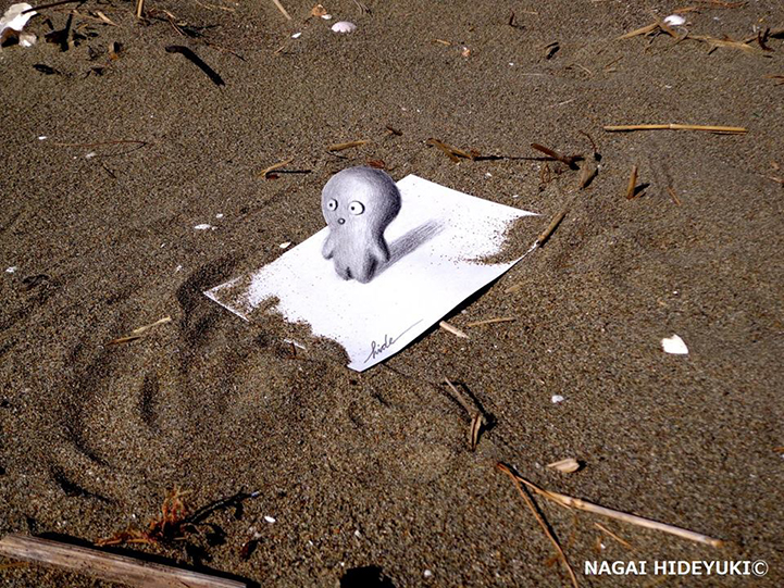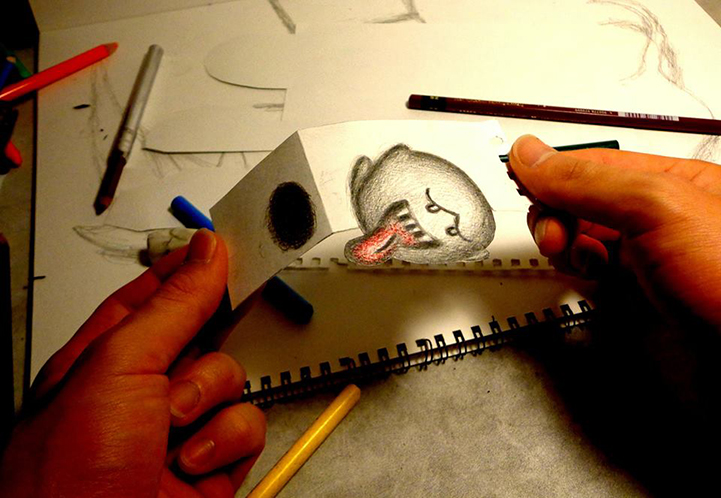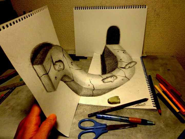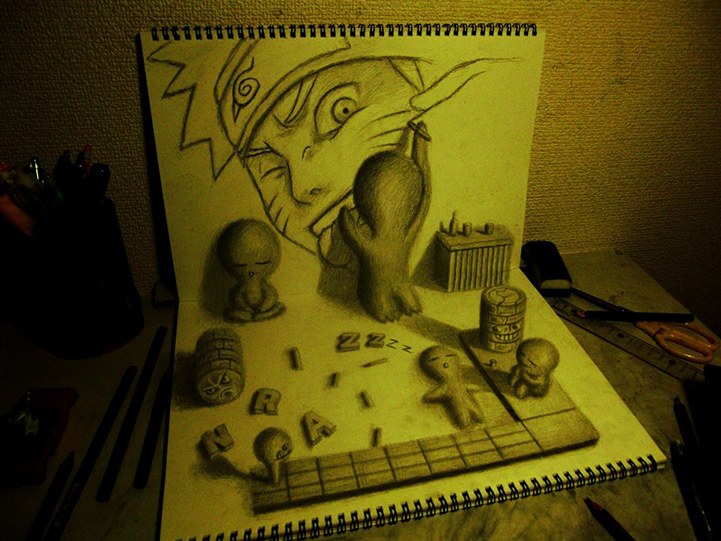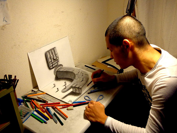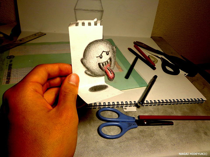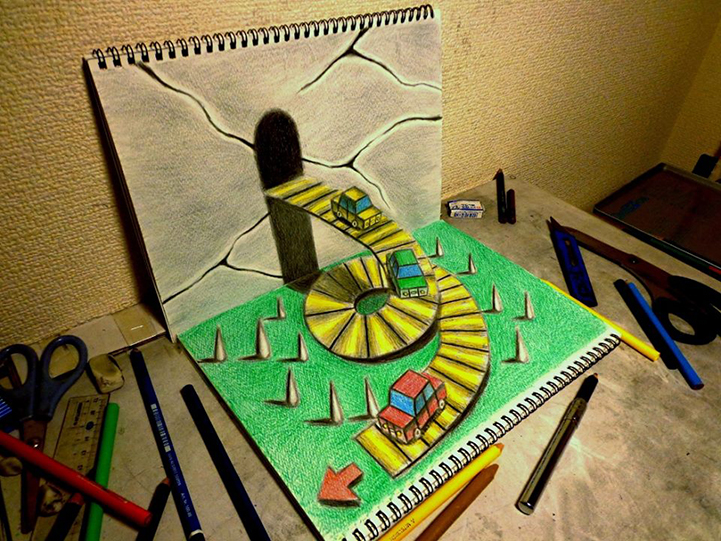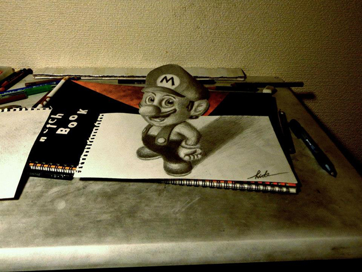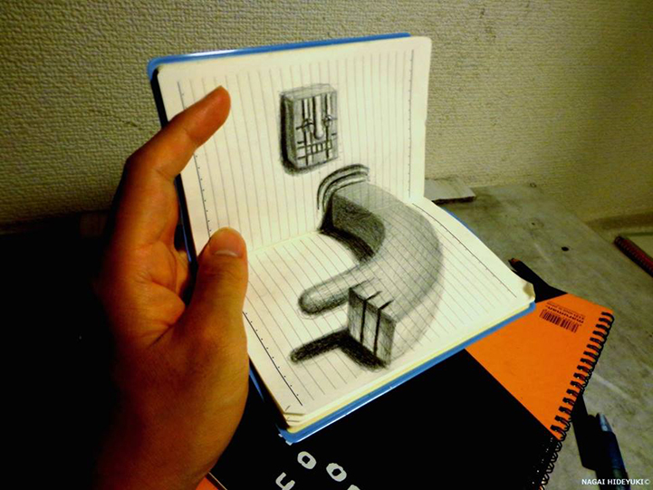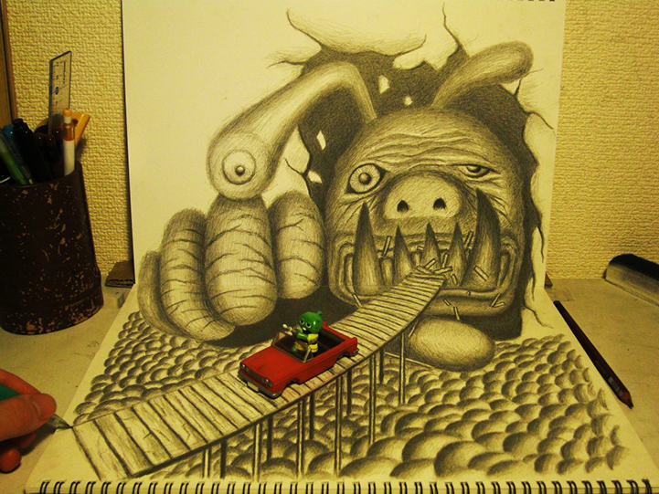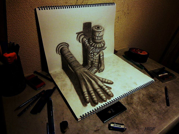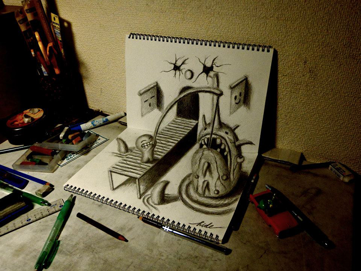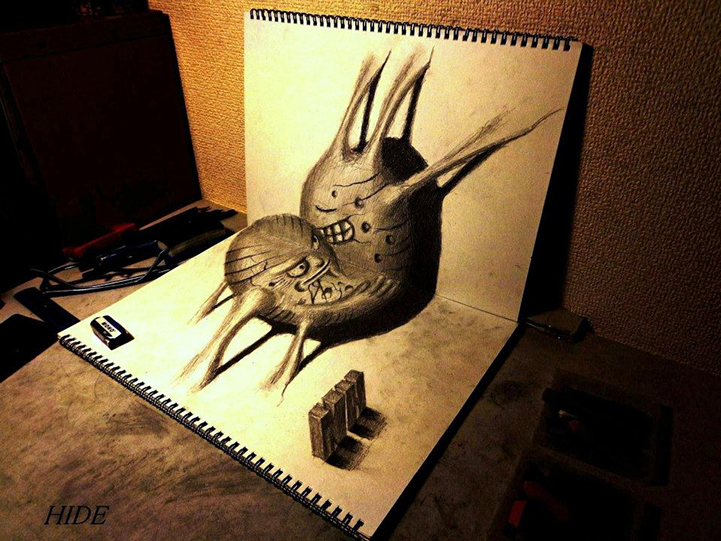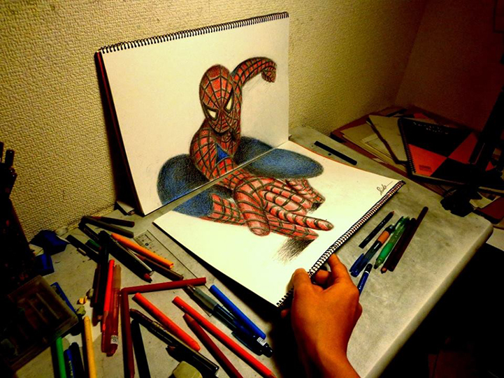 In his playful 3D art, Hideyuki has drawn everything from silly monsters emerging from paper to a colorful Spiderman who is poised and ready for action. The artist focuses on strong lights and shadows and uses multiple notebooks propped and angled to produce his clever illusions of depth.
