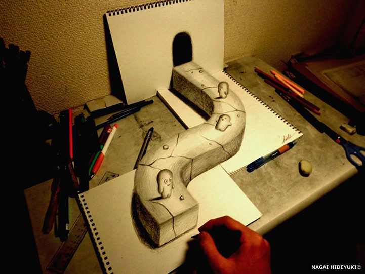 Japanese artist Nagai Hideyuki has an incredible knack for seeing the potential for cool perspective drawings along flat surfaces. As we've seen before, all he needs are some colored pencils, charcoal, and a few notebooks to create his amazingly detailed illustrations that jump off the pages in lively and entertaining forms.