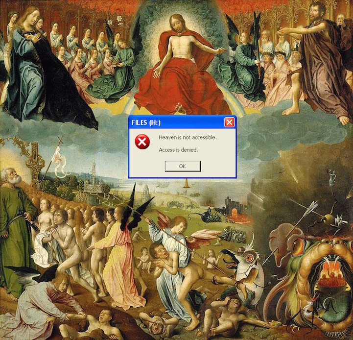 After the Hopper set, Ptichek says the project “turned into a full concept of correlation between computer technologies and classic art.” Subsequently, in the third part, classical paintings are reintroduced as popular movie posters, mashing together such works as the film Kill Bill and the painting Judith Beheading Holofernes. In the fourth part, common social media problems and computer prompts are incorporated into famous artworks, presenting a humorous spin on many religious masterpieces. The fifth part comments on the huge presence of Google in our lives by incorporating its features and services in various artworks.