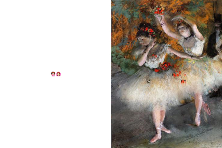 Ptichek says, “[The project was born when] I realized that standard iOS emojis strongly resemble some well-known paintings of famous artists.” In the first part of Emoji-Nation, she pairs old masterpieces with emoji representations. In the second part, she puts a social media twist on Edward Hopper's somber paintings.