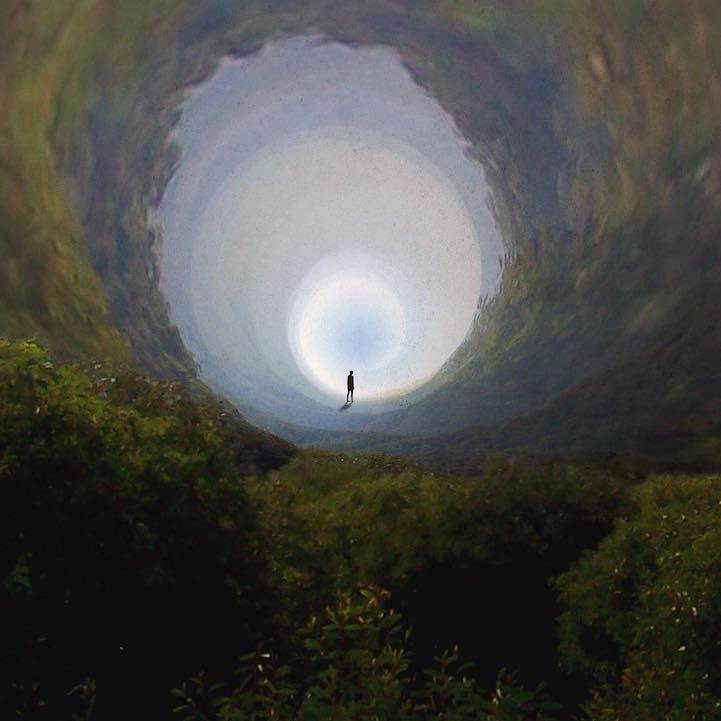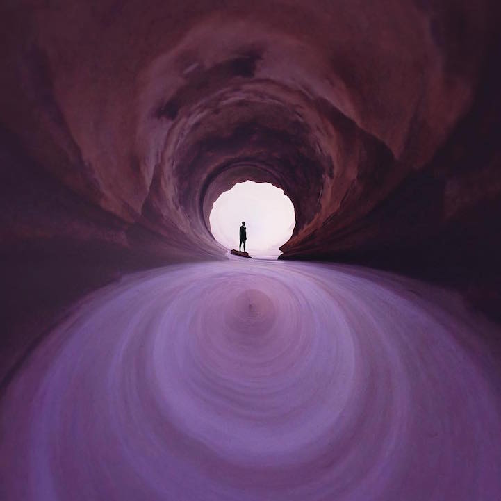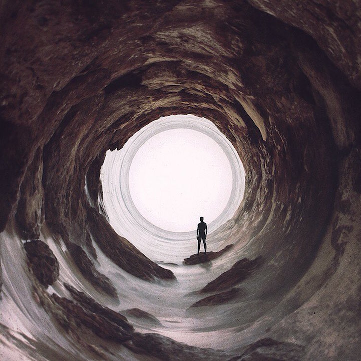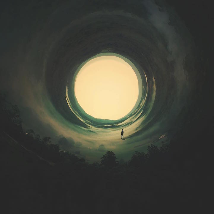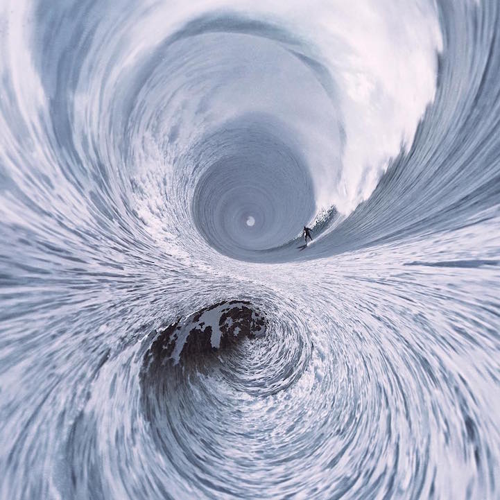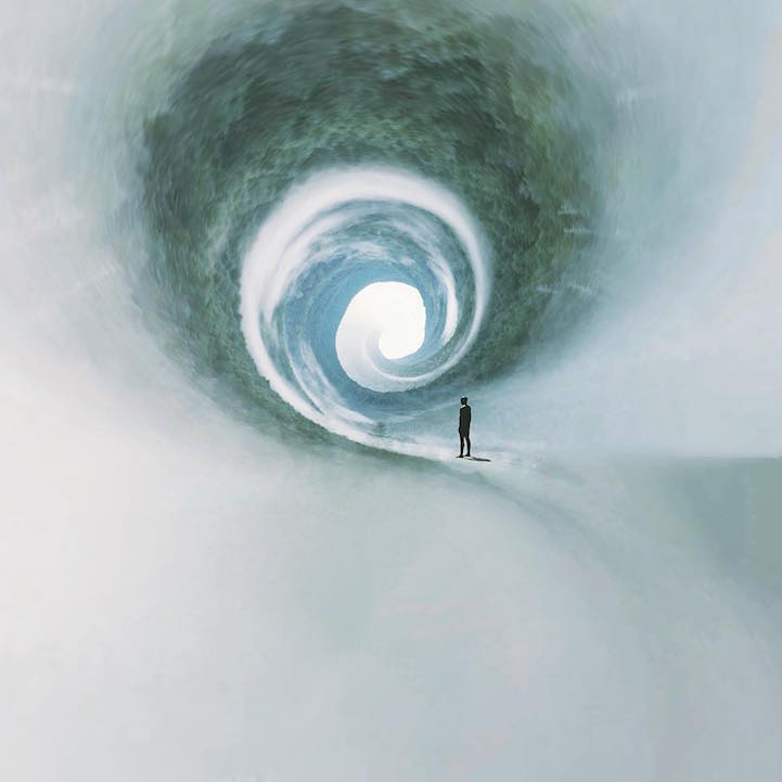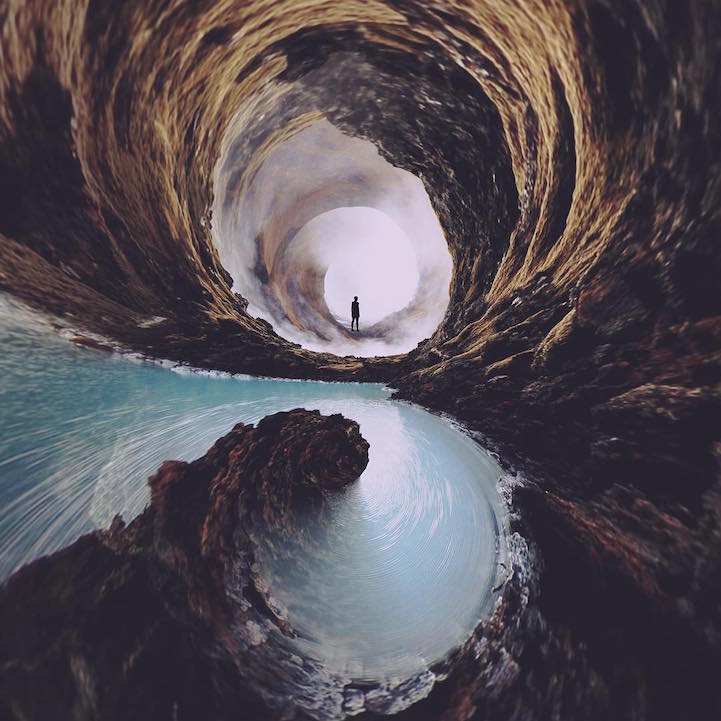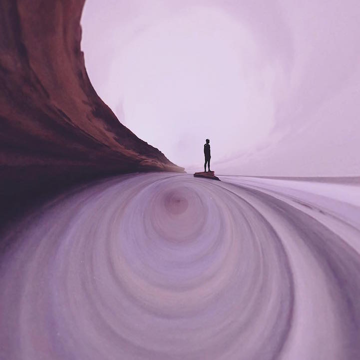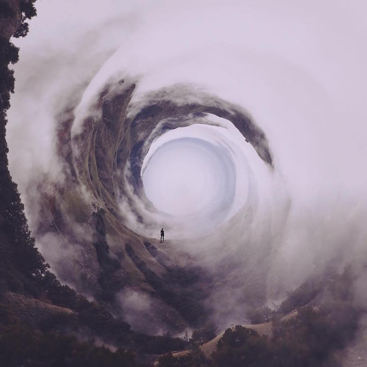 By manipulating photographs with a mix of different digital editing skills, photographer Nate Hill contorts stunning landscapes into surreal swirls, revealing imaginary portals to alternate worlds. At the center of each of his circling scenes is one tiny silhouette, paused before the center of the spiral, as if contemplating a leap into a distant realm.