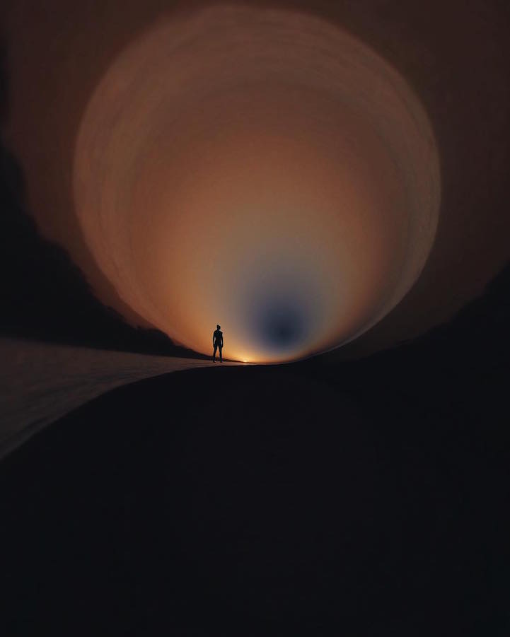 To create the phantasmagorical effect, Hill explains in Instagram comments that he uses iPhone apps like RollWorld to twist the natural backdrops, plus ones like Matter to place the single silhouetted figures in the invented settings. Though the meanings of the images are left open to interpretation, he often pairs his Instagram posts with mystifying captions—like “strange loop,” “logic of a dream,” and “silence of solitude”—as if suggesting the lonely expanses of unanswered questions we encounter when lost in wormholes of thought.
