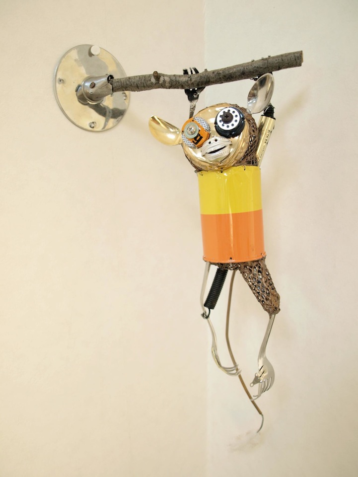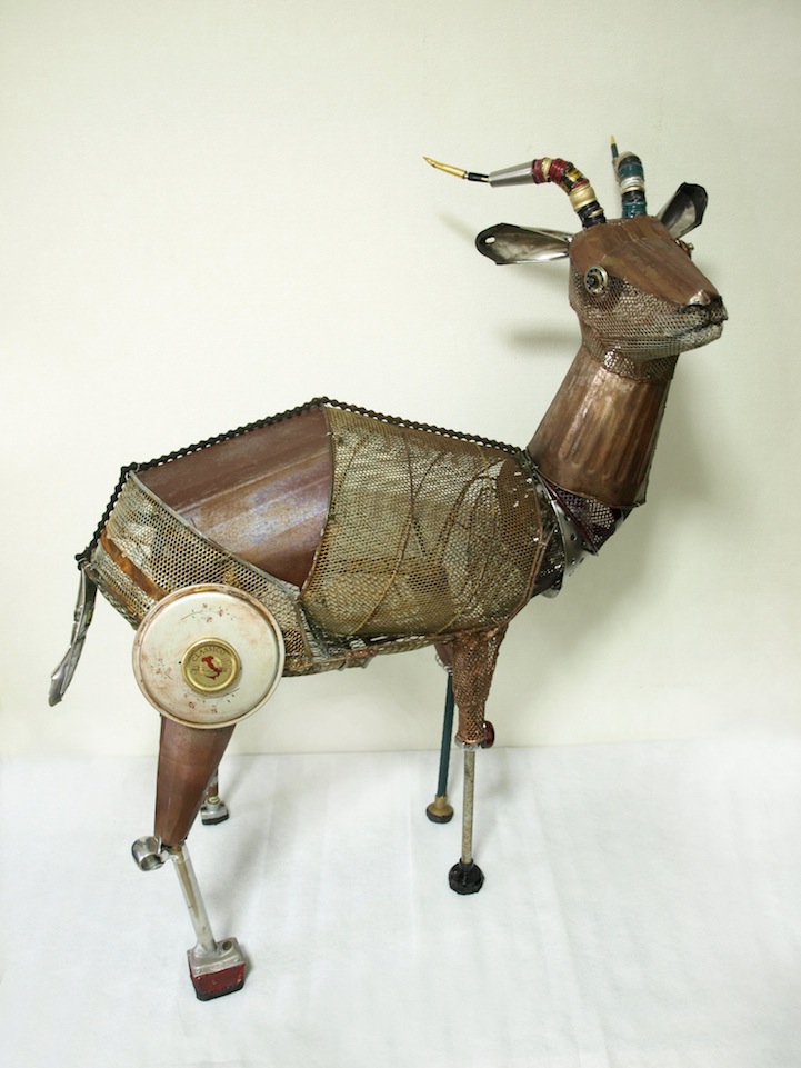 The clever creations are an amalgamation of unconventional items found in the street that have been repurposed and, thus, given a new life. The artist says, “Each of these things, which we usually use everyday, once had a story, until they were thrown away. There are bicycles that were once ridden, broken dustpans, signboards from loan sharks, lost umbrellas. Every object had purpose and meaning before they were tossed away. Taking these things that I collect, I connect them and create new life from them. For this reason the animals that are born in this way are my children. I have given them each a name, and they all live together in the living room of my house.”