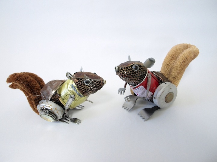 The Small Forest is an exhibition featuring a series of animal sculptures by Japanese artist Natsumi Tomita created with found objects and salvaged scraps. Using anything from a broken umbrella and bike parts to discarded cans and kitchen utensils, the gifted sculptor manages to reproduce the likeness of various creatures with a playfully creative aesthetic.