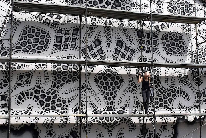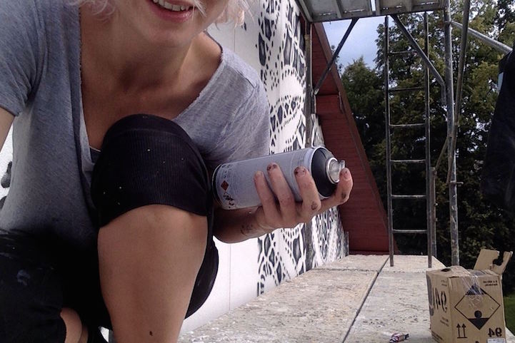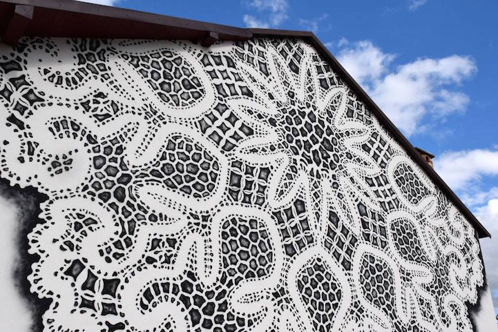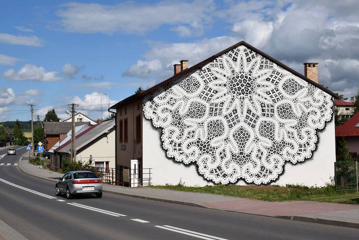 Warsaw-based artist NeSpoon has recently brought her delicate works to the streets of Bobowa, cloaking a building in a beautiful “bobbin lace” mural. We've long admired her outdoor ornamentation, which can take the form of large-scale paintings or small stamped sculptures. Here, she's used a large, detailed stencil to spray the doily on the side of a wall, shading it to create the illusion that there's a giant textile draped from the roof down to the floor. It's an exquisite addition to everyday architecture, turning the once-dull facade into an intricate work of art.