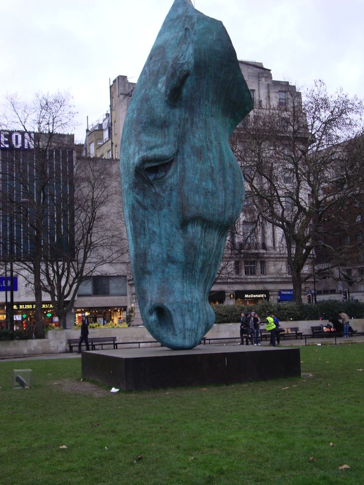 Still Water is a bronze installation located in London, England. The design stands more than 30 feet high and features a horse head balanced on the tip of the nose. After spending hundreds of hours creating the sculpture, and with great pride for his work, Fiddian-Green recently hired a cherry-picker to lift him up 30 feet in order to clean off the pigeon poop that was splattered across the surface.