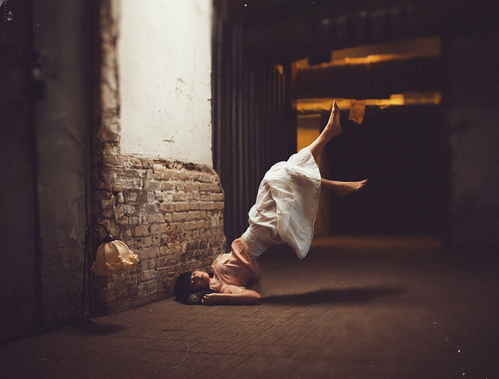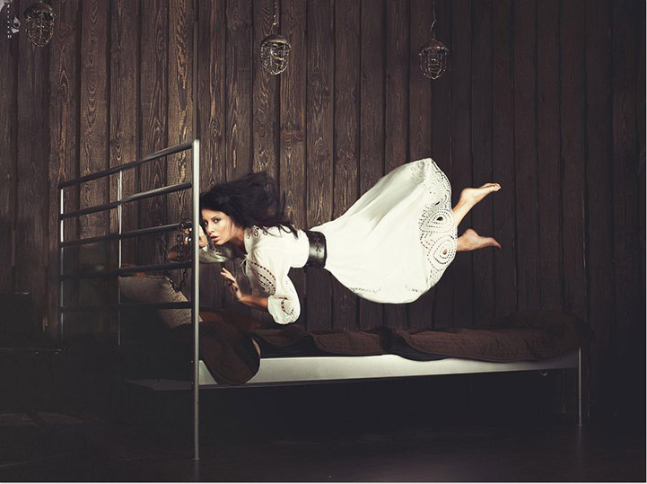 In this project called Zero Gravity, Moscow-based photographer Nikolay Tikhomirov creates dramatic portraits that feature elegant female figures casually drifting into the air while everything around them stands still. The artist's surreal worlds are a creative blend between dreams and reality that seem to be emerging from the minds of the women while they sleep.