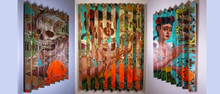 Randy Noborikawa's paintings will surely make you do a double take. If you view them from the center, you will see the overlap of two images, but from one side or the other, they appear to be separate images.