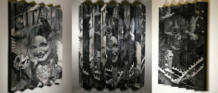 His image choices specifically work together to portray a message through their relationship. Noborikawa says that the lenticular paintings “create a wonderful abstraction that could never be planned, when viewed from straight on.”