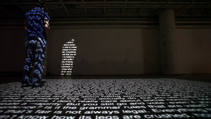 The interactive typographic installation titled In Order to Control features a constant loop of selected text about “the threshold [of] ethics and morality” projected on the ground. (You can read the full transcript of the projection here.) The most interesting thing about the project is the interactivity and its reliance on audience participation. As spectators step into the installation to read the projected content, their blackened silhouette covers the words on the floor and transfers them to the proximate wall.