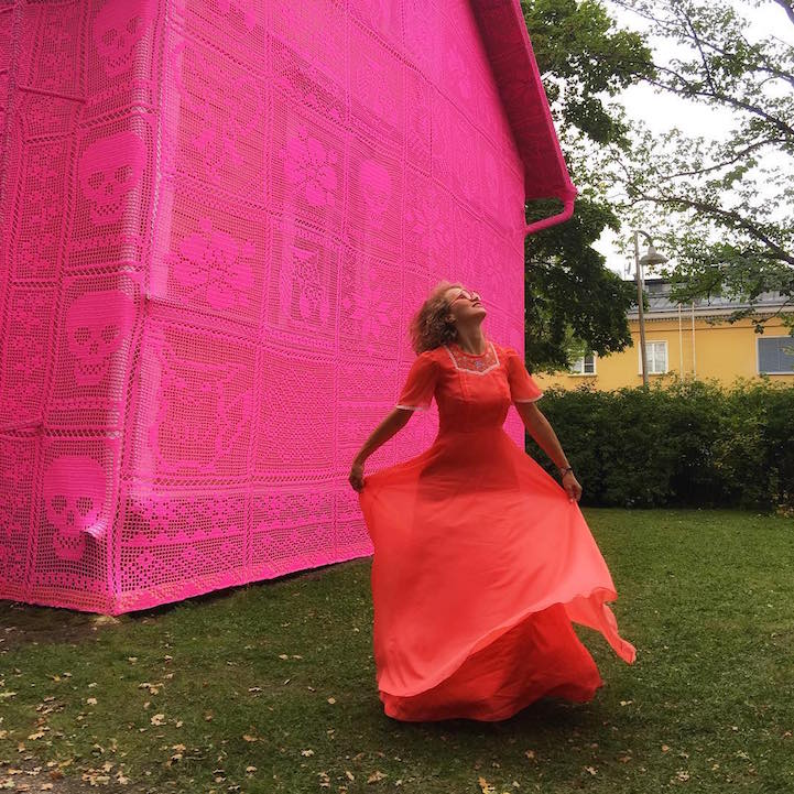 Following the explosive segment, Olek's project was far from over. What falls down must be built up again—this time with a statement of hope. “After I exploded the house, I wanted to create a positive ending for them as a symbol of a brighter future for all people, especially the ones who have been displaced against their own will,” Olek said. She and her team of women began to create swathes of pink crochet, which would cover two houses of hope: one in Avesta, Sweden and one in Kerava, Finland. This time, neither house would be touched by devastation.