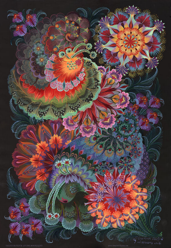 Skytsiuk's unique approach originated from a small Ukrainian Petrykivka village. She's carried on the tradition, and her work is well regarded; the artist is a member of the National Masters of Folk Art Union of Ukraine, and she's considered a Specialist in her field. Not surprisingly, you can find her paintings in both international exhibitions as well as private collections all over the world.