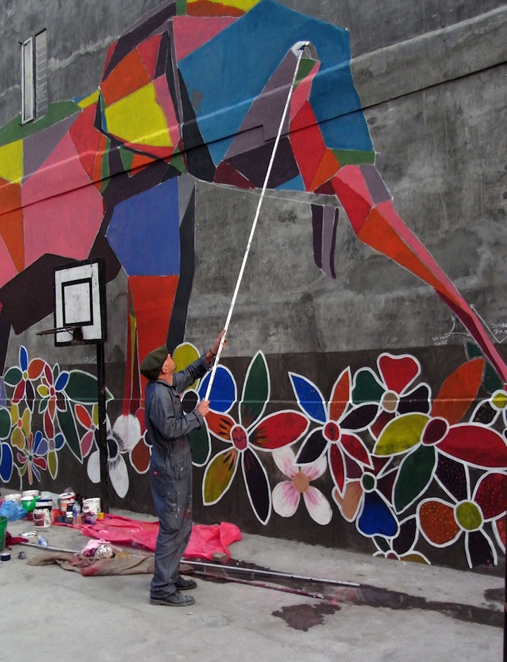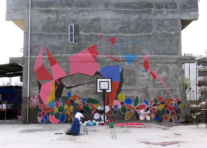 The bright mural of the geometric elephant walking through a field of flowers was created with the assistance of children from the local Shikshantar School. Because painting supplies like scaffolding and ladders are hard to come by in Kathmandu, Daas had to improvise by attaching paintbrushes to 12-foot poles. “It was a crazy technique, but lent itself to interesting effects and mistakes,” Daas said.