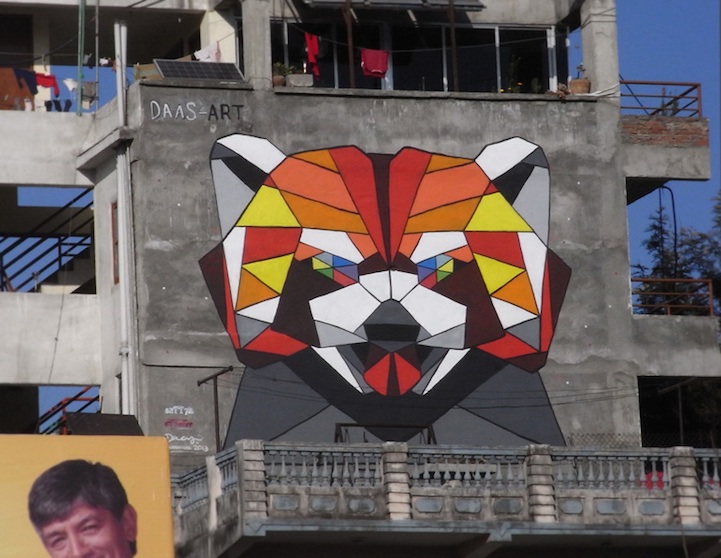 Artist Daas painted among other things a red panda and a colorful elephant. The red panda is a small mammal that lives in Kathmandu's Rasuwa district. It's on the endangered species list. Daas was excited to shed light on this problem as well as to bring color to the drab town. “Knowing that thousands of people, everyday, will see this huge, colorful painting – in a sea of grey, deteriorating buildings – felt like I was helping to breathe new life into the city. I wanted to give the people something to spark awareness as well as imagination,” he said.