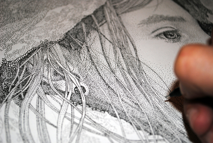 Artist Pablo Jurado Ruiz uses impressive Pointillism techniques to fill his black and white illustrated portraits with great detail and personality. Based in Spain, the artist focuses much of his time on portraying people with realistic style. He uses just black ink on paper to produce thousands of repetitive little dots that result in the various shades of gray and rich black across the page.