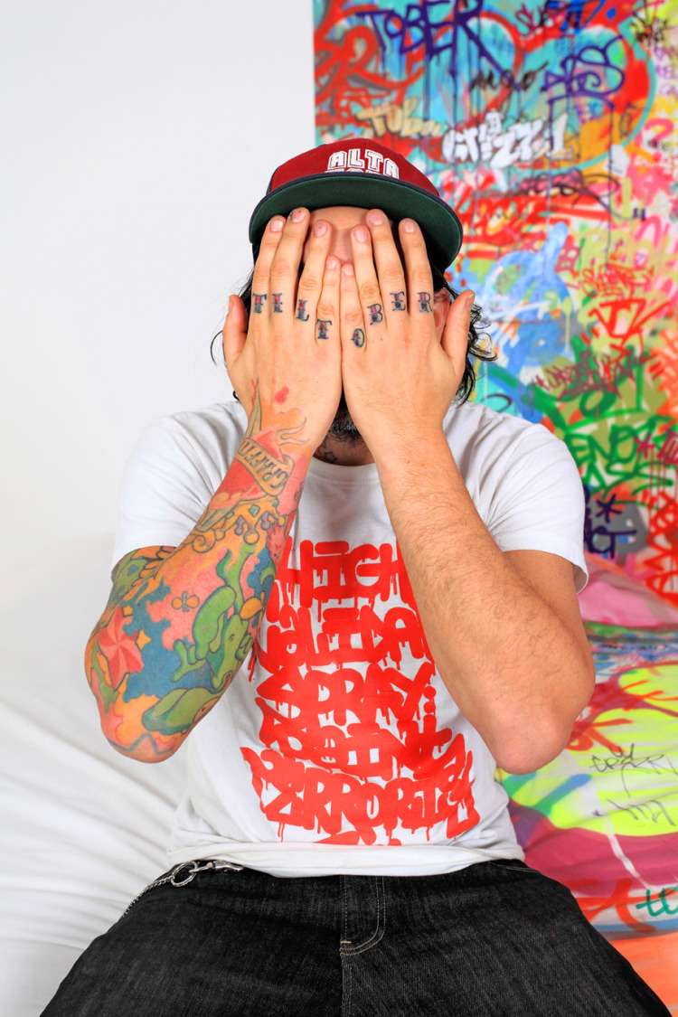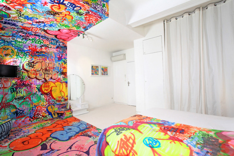 Though there isn't much information about this particular room yet (we're still searching), the photos, taken just last month by designer and photographer Big Addict (aka Roudet Benjamin), speak for themselves. While one side of the room is decorated in stark white, the other has Tilt's colorful graffiti spray painted all over, including the walls, the floor, and even the bed!