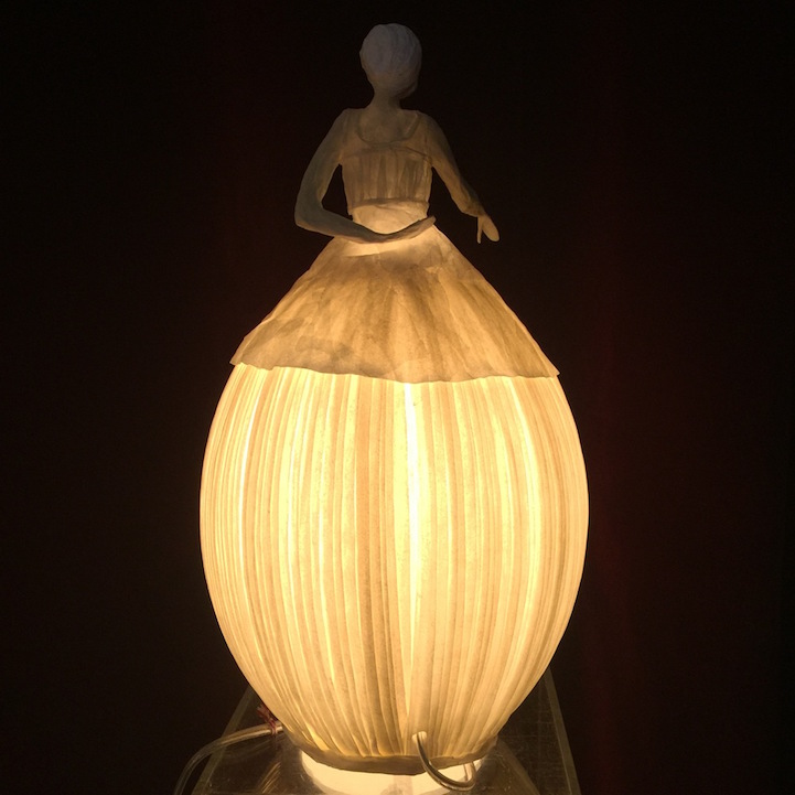 For nearly 10 years, Sophie Mouton-Perrat and Frédéric Guibrunet have combined soft lighting with delicate paper craft to create ethereal sculptures. Working under the name Papier à êtres, the duo uses the papier mâché technique to construct life-sized women clad in elegant, billowing gowns that double as lamps. The top portion of the unconventional, all-white lantern features the ladies’ upper bodies while their pleated skirts illuminate the space.