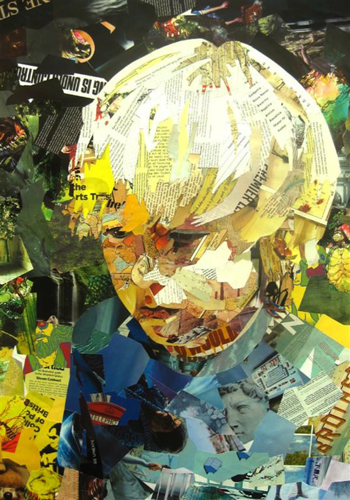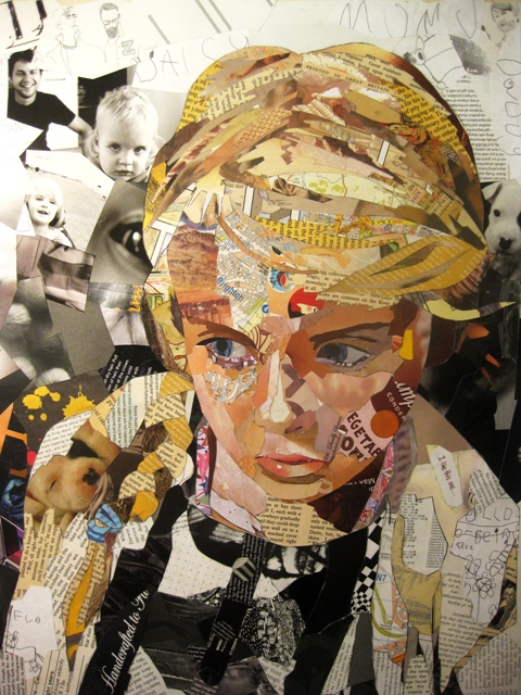Originally mainly a painter, artist Patrick Bremer has recently started making quite extraordinary collage work as well. He creates his pieces with layers of collaged magazines and books on paper. Based in the UK, the artist chooses strips and chunks of paper that fit the image both visually but also sometimes textually, it isn't as haphazard as it appears! He said, “Some pieces are chosen specifically because the image or text relates to the sitter, but others are left to chance. The pictures work on the first level as a portrait, but then you can move closer to explore and read the information within it.”