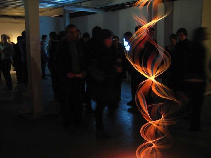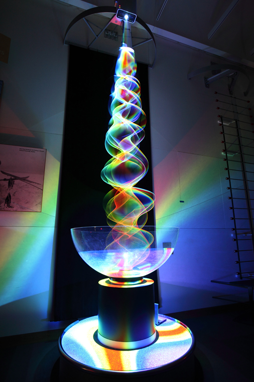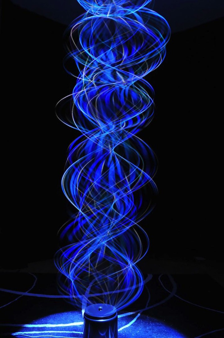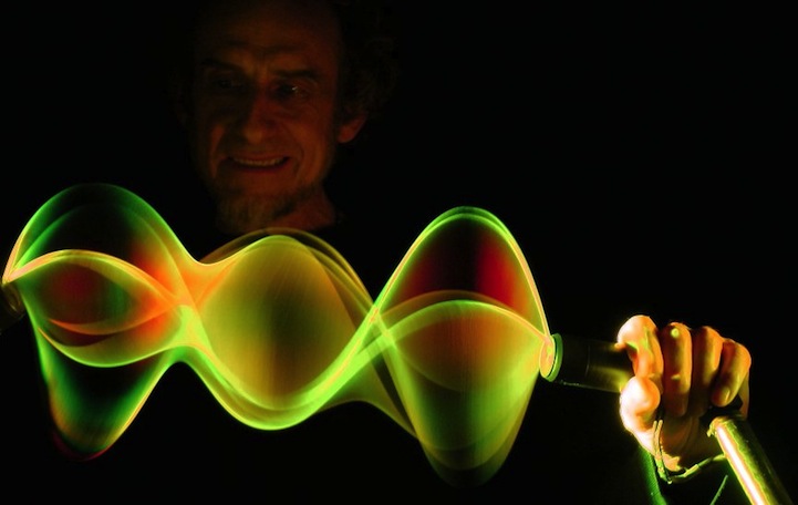 British artist, physicist, and all-around science enthusiast Paul Friedlander produces kinetic light sculptures that provide a colorful feast for the eyes. Each piece in his body of work offers a visual medley of light and motion by rapidly rotating a piece of string through white light. The vibrating rope becomes invisible to the human eye, but colors from the light (which would normally be invisible to the naked eye) are revealed in rapid succession.