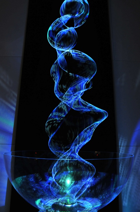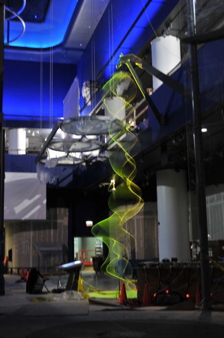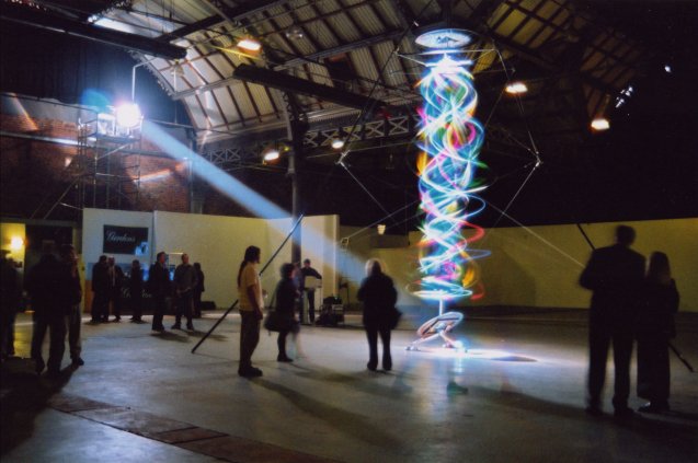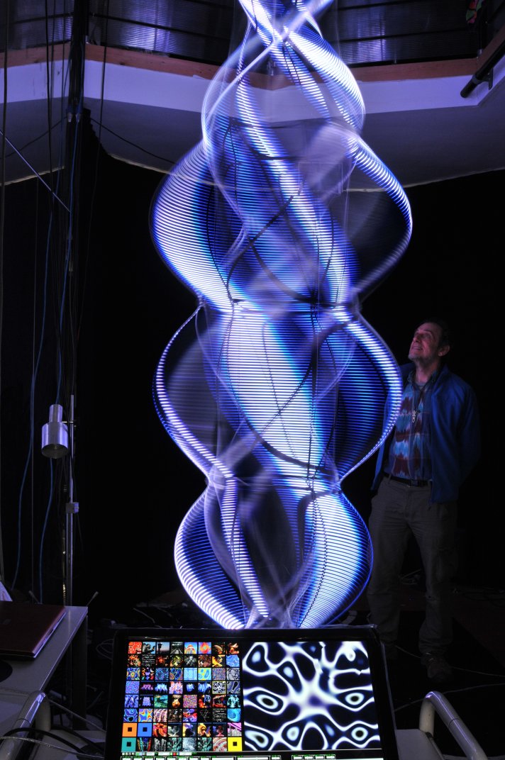 The scientific artist gives insight into the history of his career shift into the arts and explains the science in it all: “I decided to focus on kinetic art: a subject in which I could bring together my divided background and combine my knowledge of physics with my love of light. In 1983, at London's ICA, I exhibited the first sculptures to use chromastrobic light, a discovery I had made the previous year. Chromastrobic light changes color faster than the eye can see, causing the appearance of rapidly moving forms to mutate in the most remarkable ways.”