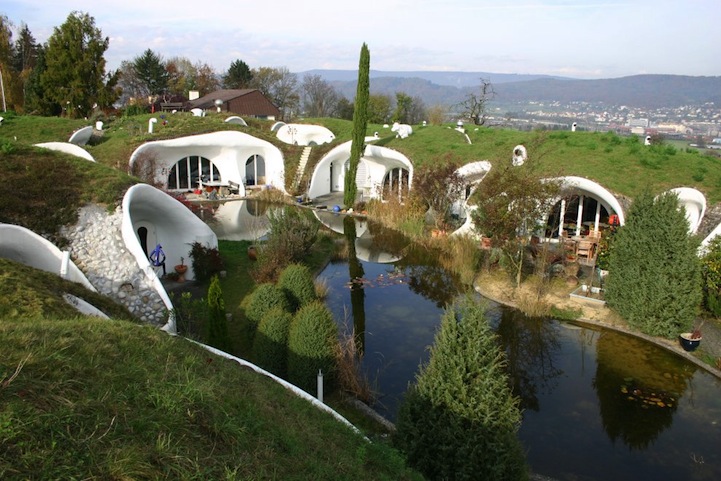 Earth House Estate Lttenstrasse is located in Dietikon, Switzerland. The viridescent mounds of earth have the homes tucked in beneath them, keeping them almost hidden. It's like stumbling upon a secret underground society that has balanced the best of modern design and energy-efficient living. They appear like cozy huts to live in but are actually quite spacious inside. The estate includes 9 separate homes, featuring three 3 bedroom, a 4 bedroom, a 5 bedroom, three 6 bedroom and a 7 bedroom house. There is even an artificial lake in the center, a subterranean parking lot, and room to grow vegetation on the property.