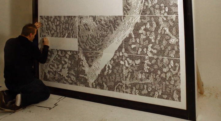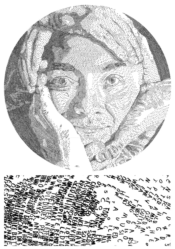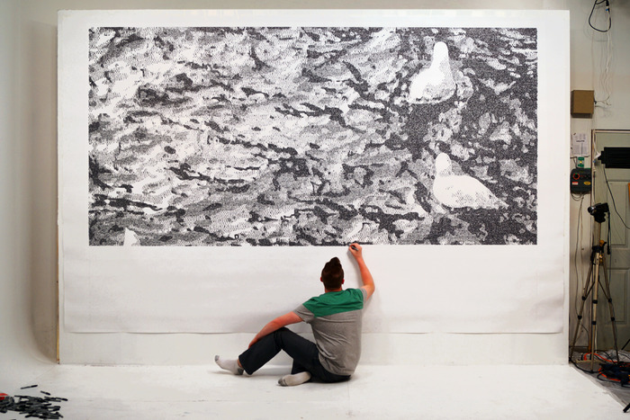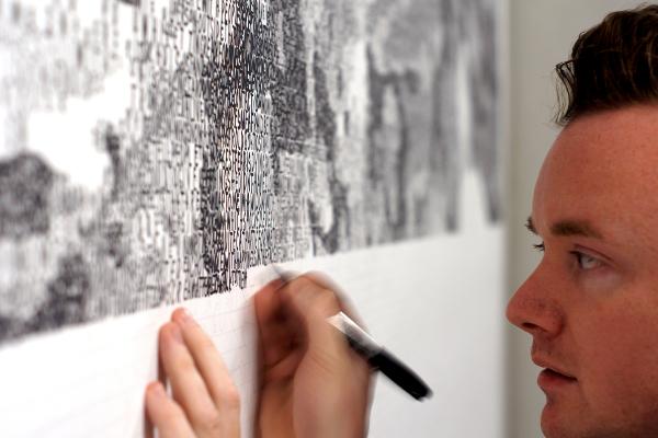 Artist Phil Hansen uses a labor-intensive approach to create his large-scale murals. Instead of simply drawing a figure or going the pointillism route, Hansen produces many of his pieces entirely out of handwritten text from submitted stories of challenges and struggles to words of encouragement and hope. Ultimately, each portrait, landscape, and scene is reflected in Hansen's process.