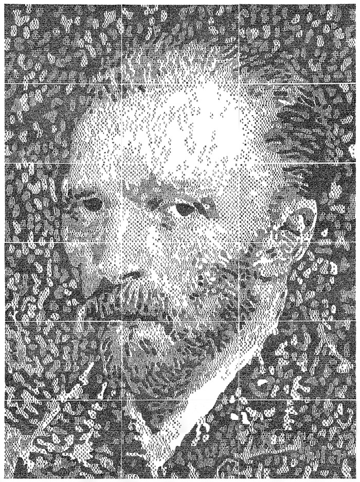 He explains, “My present approach evolved out of what seemed at the time to be an artistic cul-de-sac: damage to the nerves in my forearm from the single-minded pursuit of pointillism. Driven to think of other ways to create art, I began pushing myself to experiment with new media: my torso, a tricycle, X-rays, dandelions, the Bible, viewers' experiences, and so on. The selection of the medium became integral to the art, as much a part of the story and the holistic experience as the selected fragments themselves.”