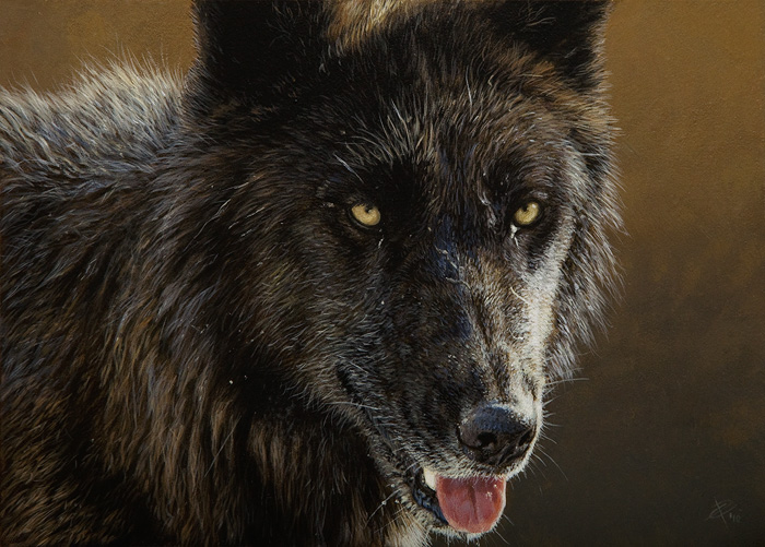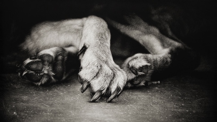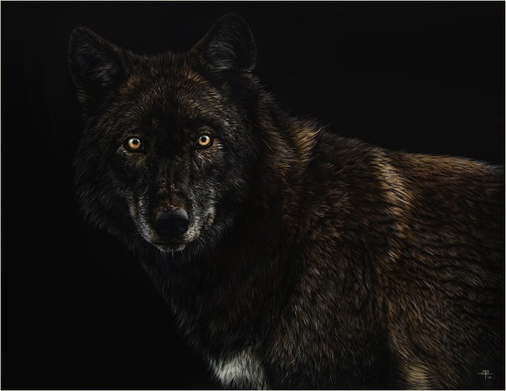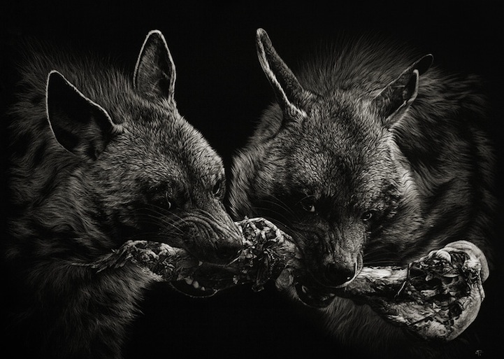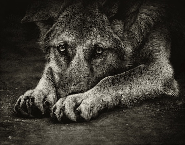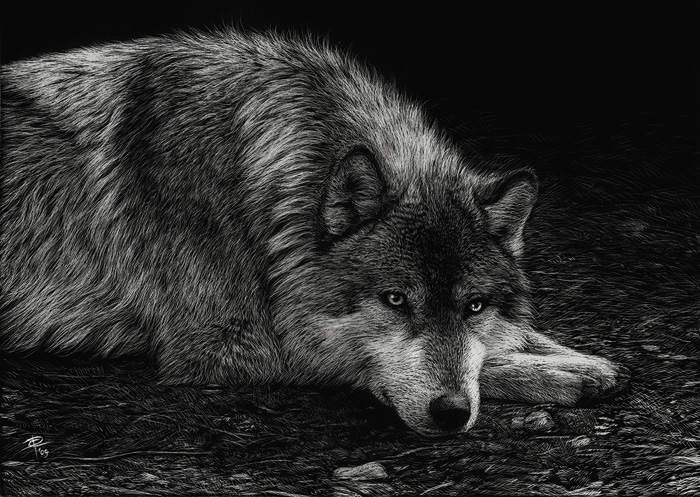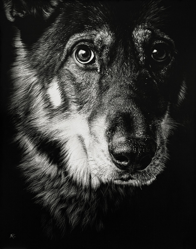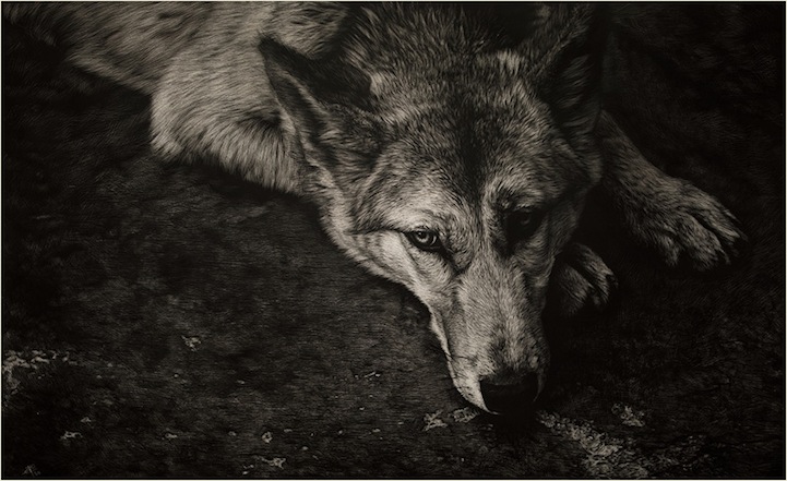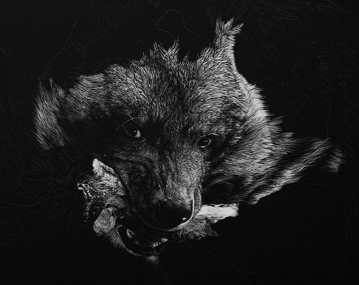“I work primarily in acrylics and scratchboard, alternating between the two as needed to realize my visions. Scratchboard is a little known medium made up of a 1/8″ masonite panel that is covered with smooth white clay and coated with a fine layer of india ink. I use a sharp knife to scratch every single detail and hair by hand. A single scratchboard piece can be made up of tens of thousands of tiny scratches layered atop one another. Additionally, I airbrush thin coats of india ink back onto my boards before beginning the scratching phase all over again for a second time. This allows me to achieve additional tones that are not otherwise possible.”