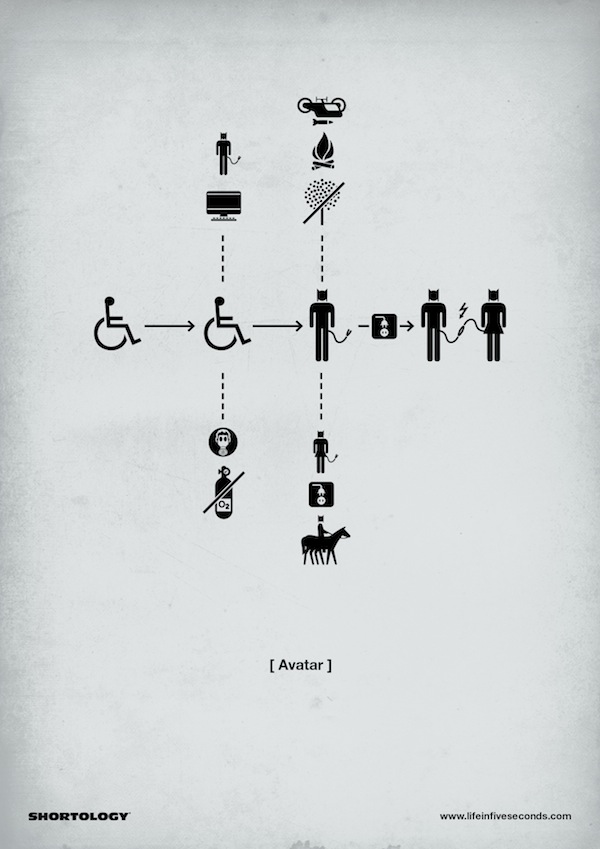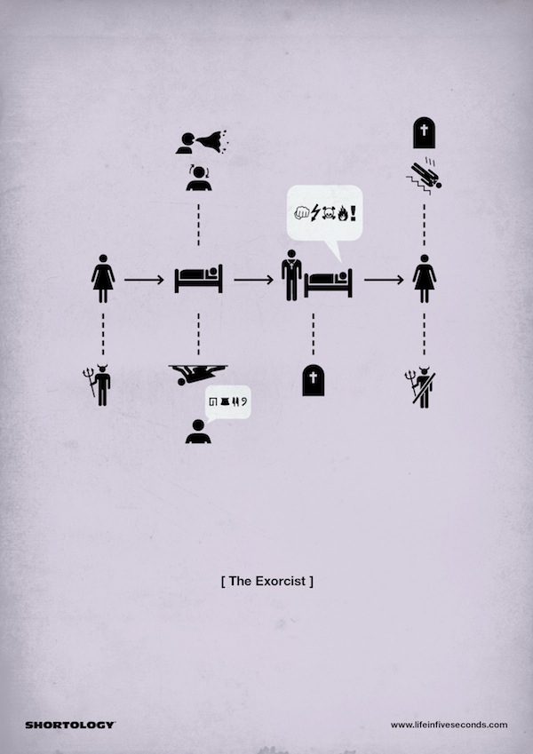 Designer Matteo Civaschi of Milan-based creative studio H-57 just sent us this awesome new collection of pictogram movie posters. A follow-up to their clever pictogram history posters, this set takes some popular movies, both old and new, and condenses their plots down to their most basic forms.