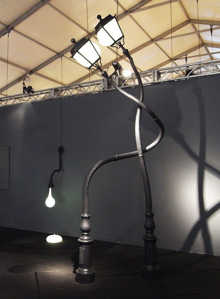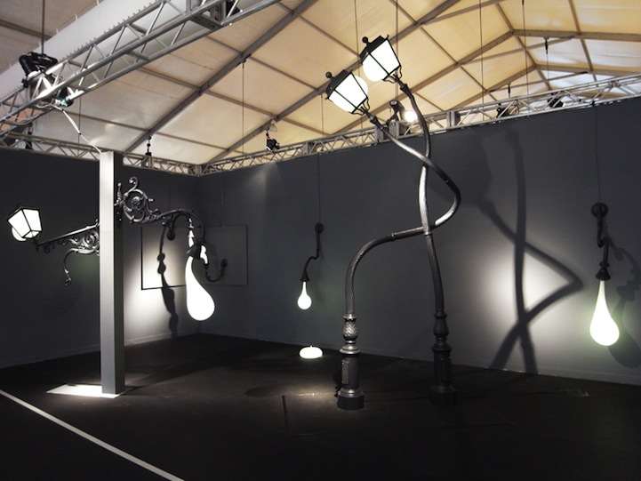 Dutch artist Pieke Bergmans playfully redesigns street lamps and light bulbs to look like animated figures. Her latest series titled Metamorphosis offers a whimsical transformation to said inanimate objects by elongating and twisting their bodies around one another. One piece in the collection is a pair of anthropomorphized street lamps that appear to be intwined in a romantic dance as one streetlight gently dips its partner. The piece has a certain romantic ambience coupled with an enchanting flood of whimsy.