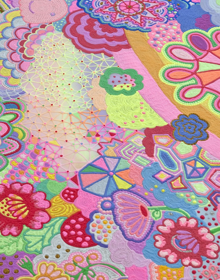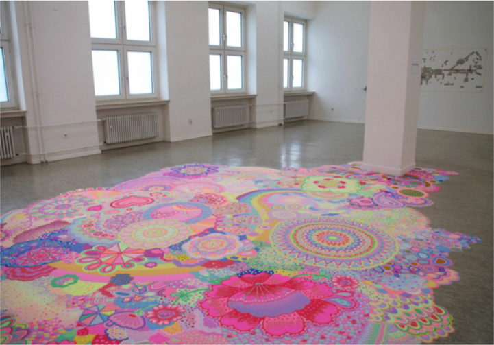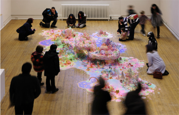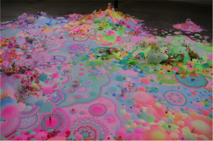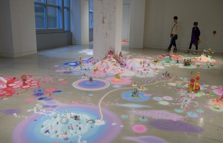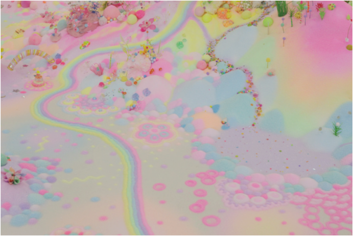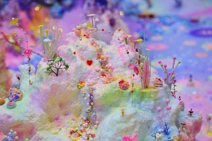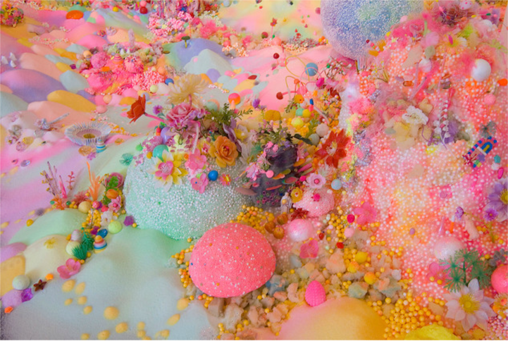 The duo, also known as Nicole Andrijevic and Tanya Schultz, create these tiny galaxies that radiate throughout the room they inhabit. The bright pinks, purples, and yellows have a girlish charm about them that echo the aesthetic of fairy tales and Japanese pop art. At the same time, they exhibit a saturation of things. Perhaps these miniature worlds are, in fact, the utopia of a material girl who yearns to live in a material world.