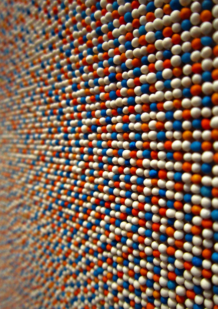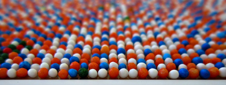 Now captivated by this technique, Brochu started experimenting with M&Ms but he soon discovered that, due to their size, you had to stand hundreds of feet away from it to actually see the image. “I really wanted to ‘wow' people,” he says, “so I needed something small but colorful. Thank God I noticed nonpareils at a local bakery.”