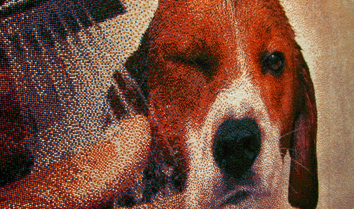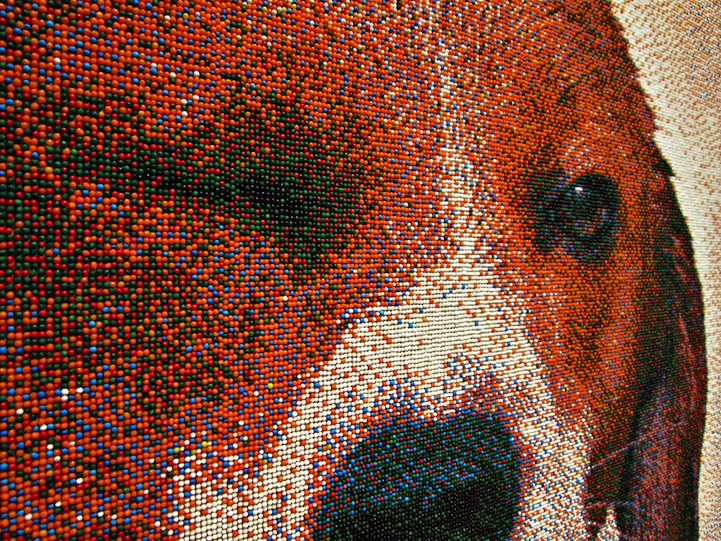 Nonpareils, which are tiny balls (1/16 of an inch wide) made from compressed sugar and used for decorating cakes and cookies became his medium of choice. He searched for a photograph until he found Shingo Uchiyama's photo of a beagle on 1x.com (shown immediately below). After he asked for permission to reproduce it, he set out to find a way to remake it using these sprinkles.
