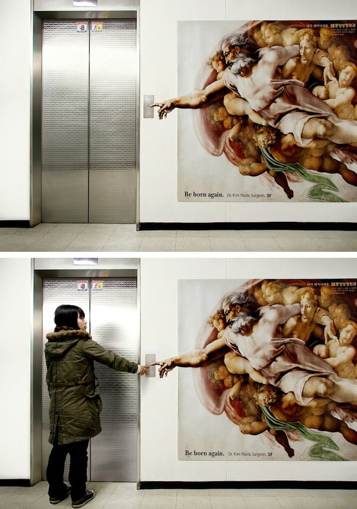 We've seen a similar kind of juxtaposition done with Michelangelo's The Creation of Adam mural on the celing of the Sistine Chapel, but this site-specific ad by Dr. Kim's plastic surgery office takes it to another level. The interactive advertisement becomes hilarious every time a visitor pushes the elevator button, as the tagline suggests: “Be Born Again.” I guess all you need to do is head to the third floor…