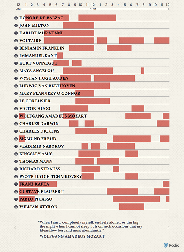 Looking at the chart, you'll notice just how varied their schedules are. Some people sleep seven or eight hours in one stretch while others will rest intermittently throughout the day. And, perhaps most surprisingly, their creative pursuits are punctuated with periods of focusing on hobbies, food, and leisure. It just goes to show that even the most influential people took a break every once and a while. To see an interactive version of this infographic, check out Podio's website.