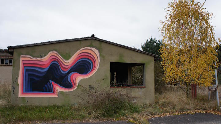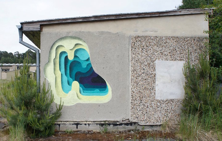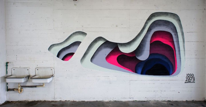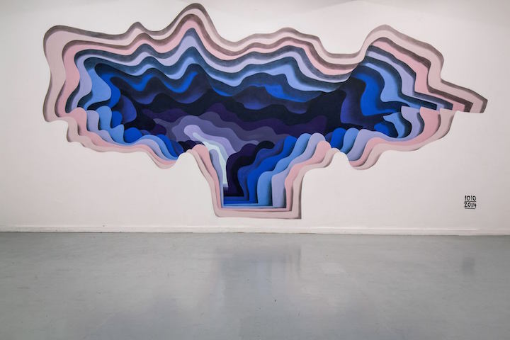 Since 2009, German street artist 1010 has been creating these mysterious, portal-like street art illusions on walls around the world. While at first glance it looks like he's layering colored paper, upon closer inspection you realize that you're actually looking at paint on a wall. It's a different type of street art than we're used to. Recently, for the urban and contemporary art festival in Hamburg called Knotempunkt, 1010 created a huge mural that was layered in colors; blue, purple, red, and black. (See above.) The paper-like layers descend into darker colors until it feels like you're looking into a dark abyss.
