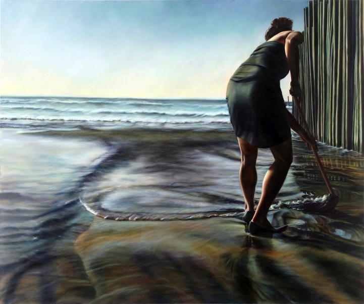 Mexican-born painter Ana Teresa Fernandez holds a master's degree in Fine Arts at San Francisco Art Institute and has exhibited internationally in Mexico and South Africa. Her paintings attack the double standard imposed on women, showing them performing menial tasks like laundry and sweeping. “The notion of trying to mop the beach, sweep the sand, it's like Sisyphus,” she said, referring to the king in Greek mythology who is cursed for eternity to push a boulder up a hill only to watch it roll down again. “People who may have skills and trades come here and end up in this menial work, cleaning hotel rooms, washing dishes. But there's strength, persistence, to get up every day and clean up after someone else. I try to humanize it a little bit.”