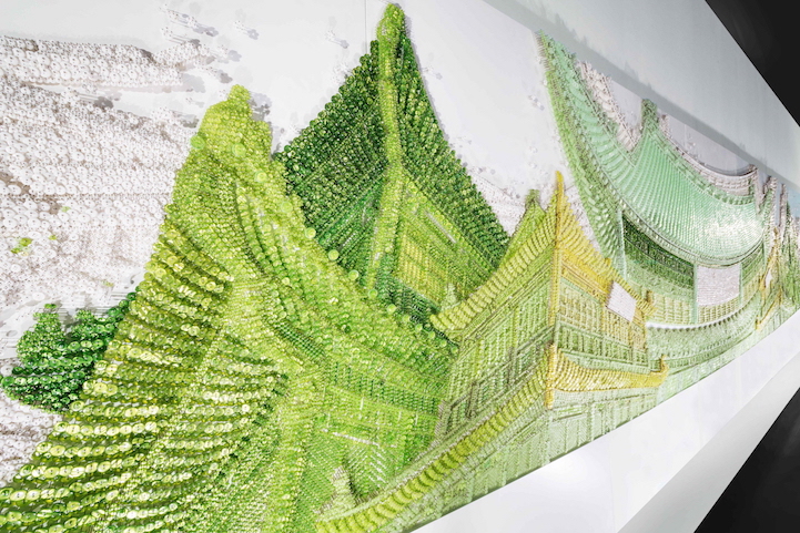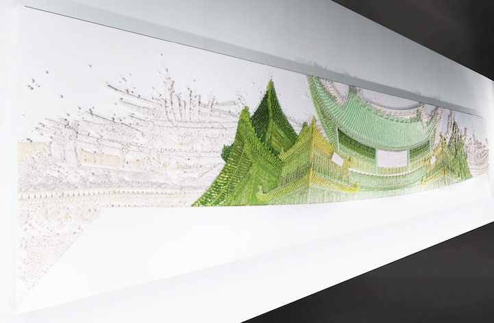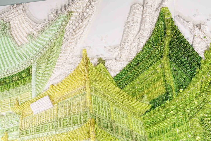 Button connoisseur Ran Hwang uses her distinct style both as a form of expression and as a form of meditation. When designing large installations made solely of buttons, beads, crystals, pins, and thread, Hwang becomes completely immersed in the project at hand and allows her work to consume her thoughts. “I create large icons such as a Buddha or a traditional vase, using materials from the fashion industry,” she writes. “The process of building large installations are time consuming and repetitive and it requires manual effort which provides a form of self-meditation. I hammer thousands of pins into a wall like a monk who, facing the wall, practices Zen.”