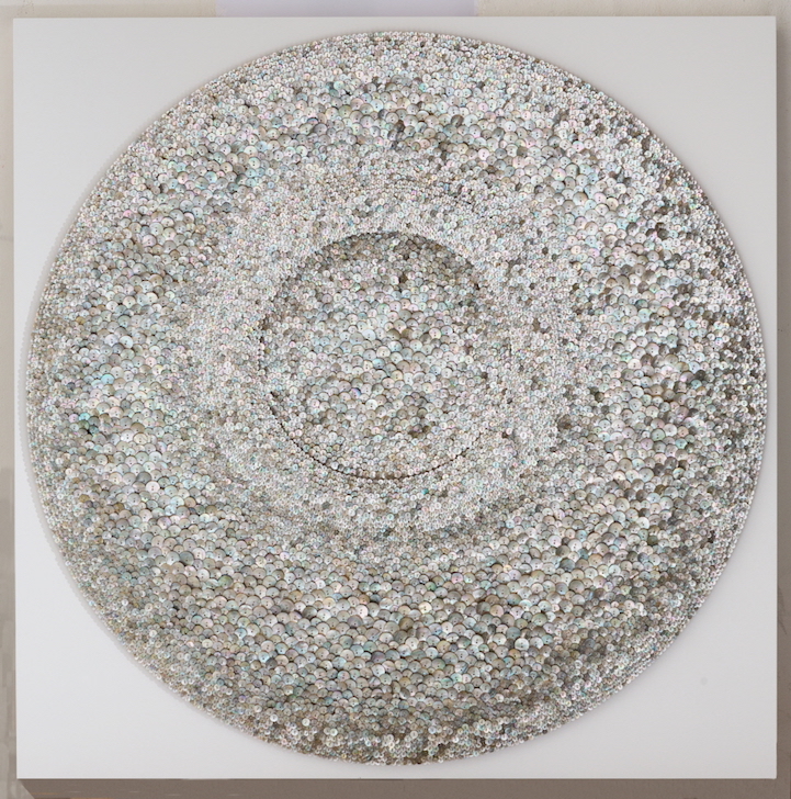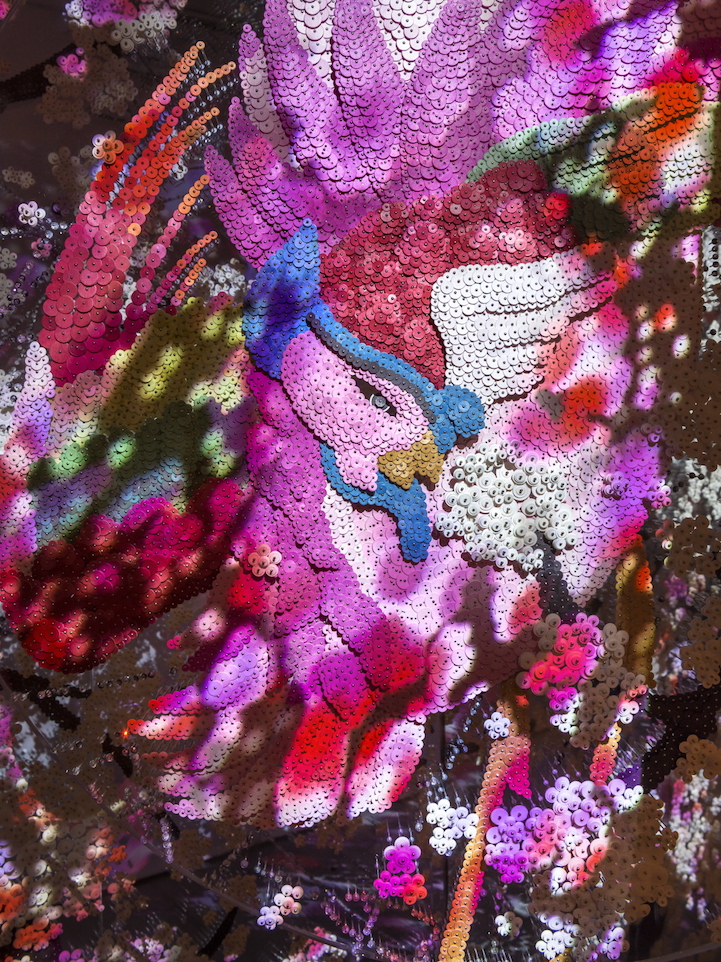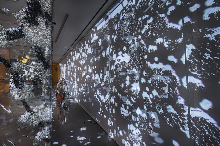 In addition to her impressive beaded plexiglass pieces, Hwang also incorporates video into her installations. Using a projector, the artist displays a video clip upon her reflective canvas and completely transforms the exhibit. While this digital element may seem quite different from her usual work, it continues to represent Hwang's favorite themes: the circle of life, growth, seasonal changes, and self-reflection.