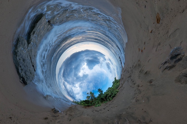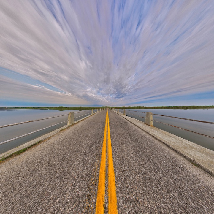 Photographer Randy Scott Slavin creates spherical panoramas that spin the world in all directions. We loved his earlier work and now he is back with more incredibly distorted worlds, entitled Alternative Perspectives 2. Through digital manipulation, Slavin transforms an average landscape into a surreal experience. His expressive compositions feature upside-down buildings, half-circle bridges, water floating in the sky, and trees that bend and curve in unusual ways.