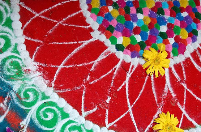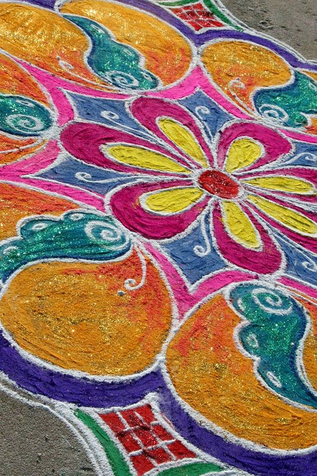 In India, there is a long-standing folk art known as rangoli (or kolam or Muggu), in which patterns are created on the floor using materials such as colored rice, dry flour, and more. The bright designs are usually made during auspicious events like Diwali, Onam, Pongal, and other Indian festivals. You'd also see them during wedding celebrations, and their presence is considered sacred welcoming areas for the Hindu deities.