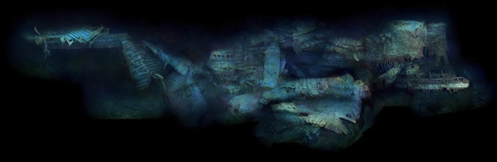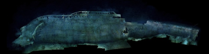 Titanic's battered stern, captured here in profile, bears witness to the extreme trauma inflicted upon it as it corkscrewed to the bottom.