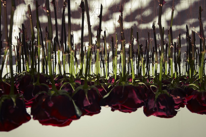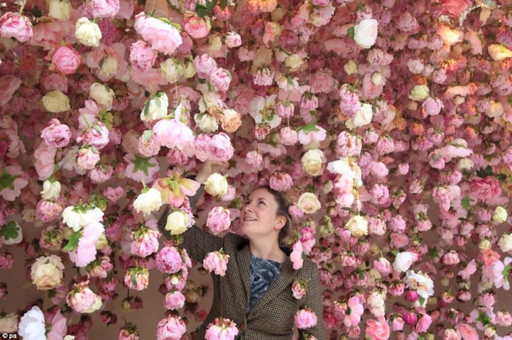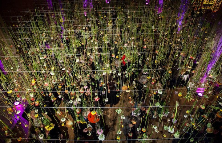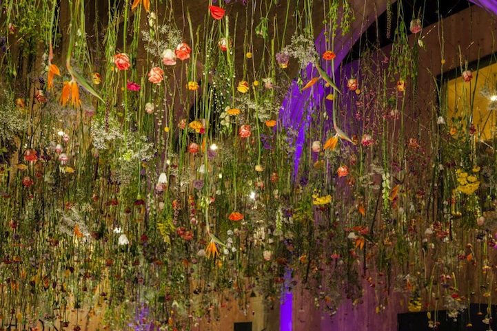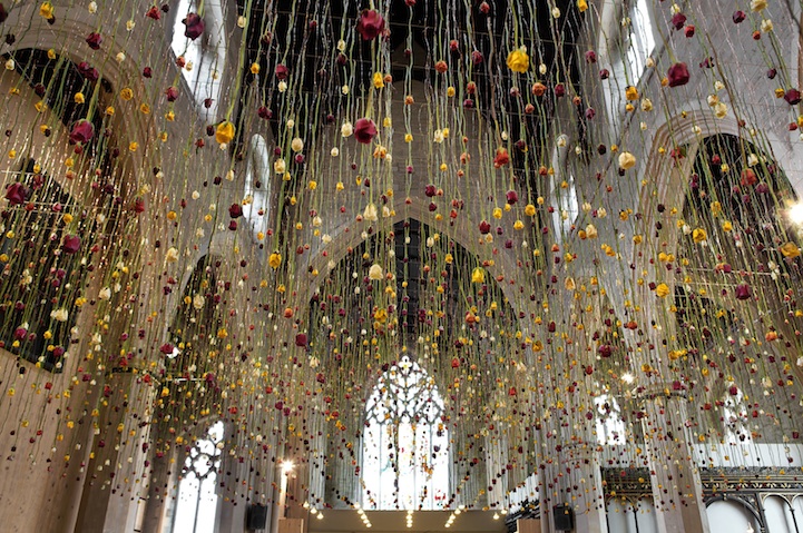 Rebecca Louise Law is known for her breathtaking installations that consist of thousands of hanging flowers suspended overhead. Last February, she was commissioned by London's Garden Museum to create a temporary, site-specific work for their Floriculture: Flowers, Love and Money exhibition. 3,500 multicolored roses were hung on copper wire and suspended in the central part of the historic building. Visitors were invited to walk beneath the ethereal canopy.
