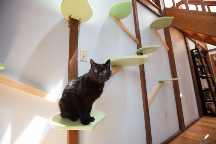Mountain installed a variety of perches and catwalks throughout the house, taking advantage of features like exposed beams. One long seat prominently sits in front of a wide, South-facing window, which lets the cats enjoy the sun and stalk local wildlife. Other additions are a custom six-foot cat tree (complete with a kitty hammock) and a special wall that looks like it has leaves growing from it. These playful spaces afford the felines multiple areas to survey their kingdom (the house) while being able to access the staircase and landing.