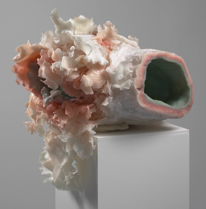 London-based artist Rebecca Stevenson creates figurative sculptures that blossom into surreal structures. Her multimedia figures, primarily constructed out of wax, incorporate floral motifs. The artists produces realistic renderings of heads paired with unconventional patterns and colors that burst out from the temple of her bodiless subjects.