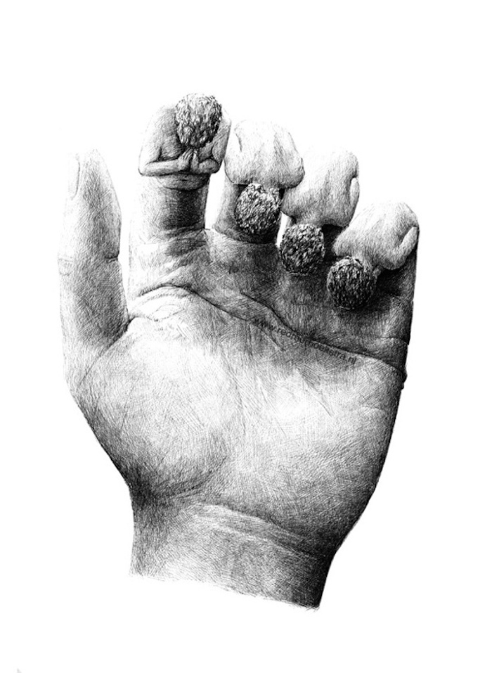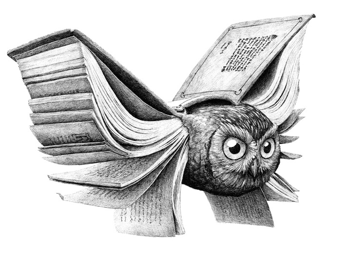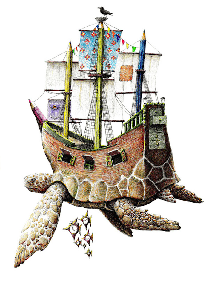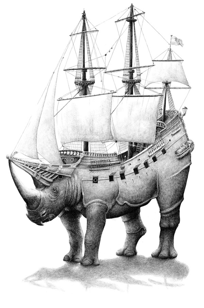 With meticulous pencil work, Hoekstra draws an owl with book wings, a sea turtle whose shell is a ship, a hand with people as fingers, and other bizarre combinations. He even tackles blending three forms together in his illustration of a whale emerging from a submarine that doubles as a banana. Whether you regard the drawings as humorous, playful, or even disturbing, there's no doubt that the artist is incredibly creative.