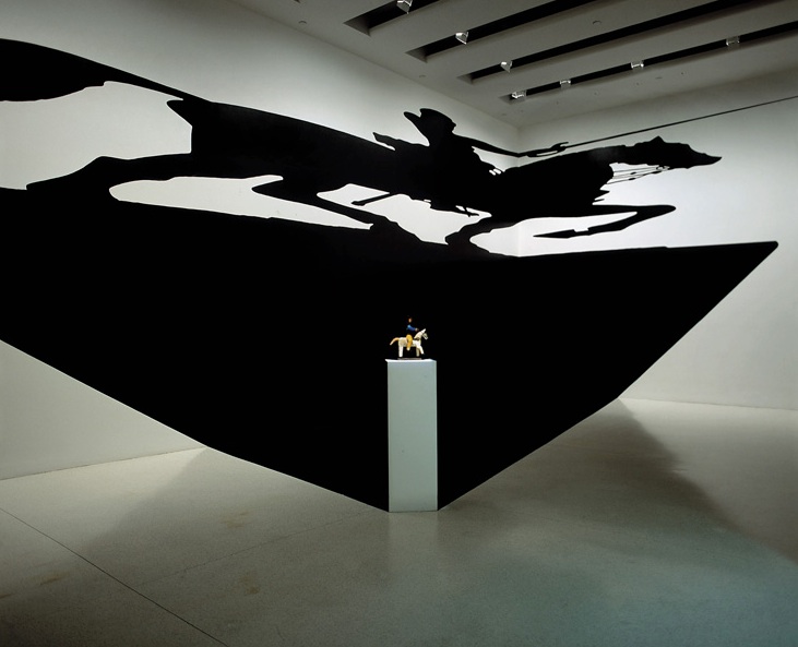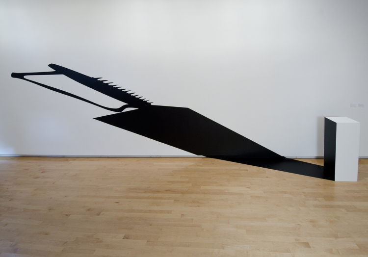 Currently, there's a selection of Silveira's work on display at The Aldrich Contemporary Art Museum in Ridgefield, Connecticut (the only museum in Connecticut devoted to contemporary art). There, she presents In Absentia, a series of absent artworks on empty pedestals. She does this by creating gigantic and distorted vinyl shadows of objects that don't actually exist.