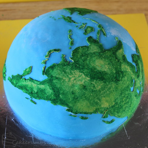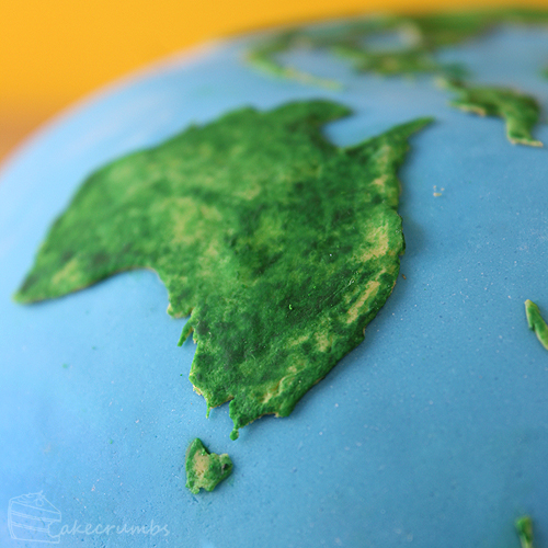 Rhiannon explains her process: “Plan B involved baking a cake inside a cake inside a cake… With the inner core, outer core and mantle all cake-d up, it was time for the crust. Chocolate buttercream filled that role… I added a little white and marbled it into the fondant to make some clouds. I hand cut all the continents from fondant, then painted them with a gel paste mixture using a dry brush technique. This process all up took me about 6 hours and was the most arduous process.”