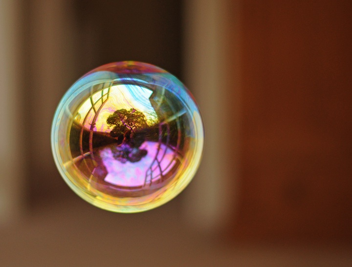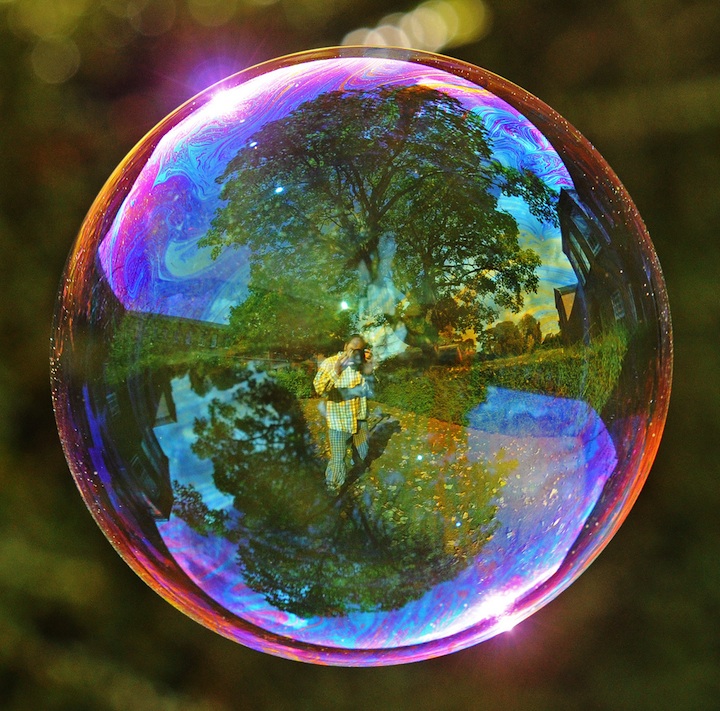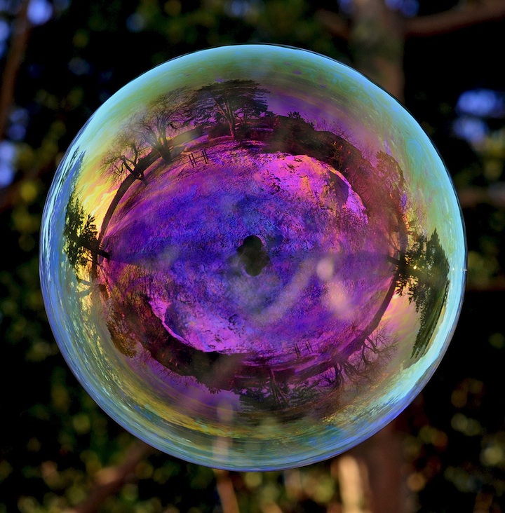 Looking through all of his photos, it's still his bubble reflections that make us stand back in awe. If you look closely, you can see Heeks in the middle of every photograph. While in some, he simply shoots bubbles with his patio door open, capturing breathtaking landscapes right outside his door, in still others, he manages to capture bubbles as they fly right over his head, creating a near unbelievable, non-Photoshopped panoramic view. “I found a shaded tree to get the all-important dark background,” he writes on Flickr. “Nature provides!”